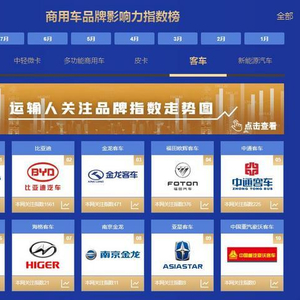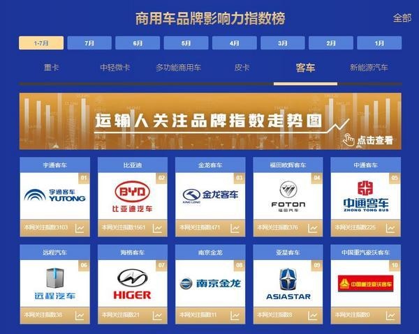 在2020年1-7月运输人品牌指数榜的客车排行榜中,宇通客车、比亚迪汽车、金龙客车、福田欧辉客车和中通客车跻身前五位。