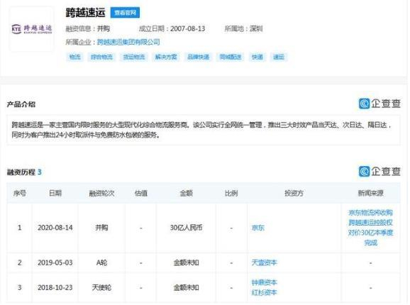此外,跨越速运分别于2018年5月、2019年5月完成A轮、B轮融资,投资方包括红杉资本中国、钟鼎创投、天壹资本。
