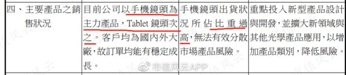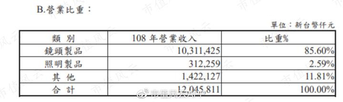 大立光并未按照产品类型进行分类披露,不过大立光在年报中表示,主要产品为手机镜头,占比极高,其次是平板镜头。