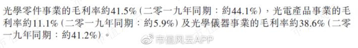 光电产品的毛利率为11.1%,光学零件的毛利率为41.5%。