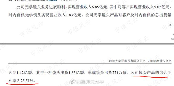 欧菲光的光学镜头业务也才起步不久,2019年的综合毛利率为25.5%,远低于舜宇光学的45.2%。