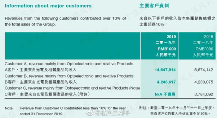 但是风云君按照2018年公司披露的A、B、C三大客户销售明细来计算,这三大客户的销售占比约为21.9%、16.3%和14.5%。这与星展银行报告中的客户占比还是有差异的。