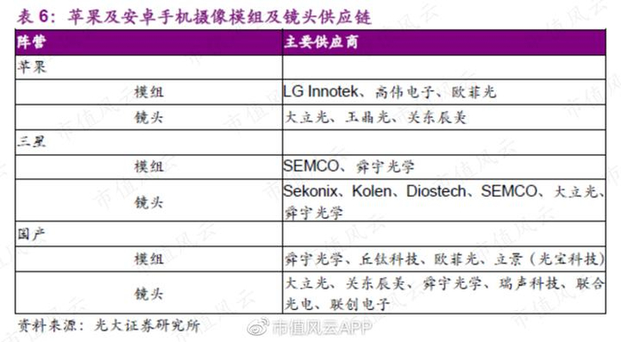 首先从下图中可以看到,大立光的镜头业务已经切入苹果产业链,而舜宇光学还不在苹果产业链中,公司业务更多的是在三星产业链和国产手机产业链中。
