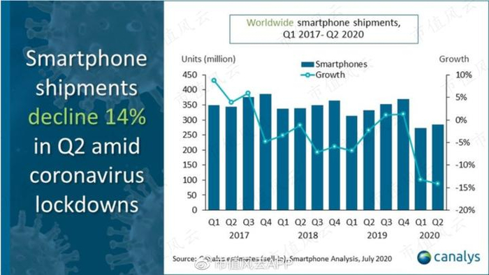 全球手机市场也相对低迷,再加上突如其来的新冠疫情,2020年第二季度全球智能手机出货量同比下滑14%至2.9亿部。