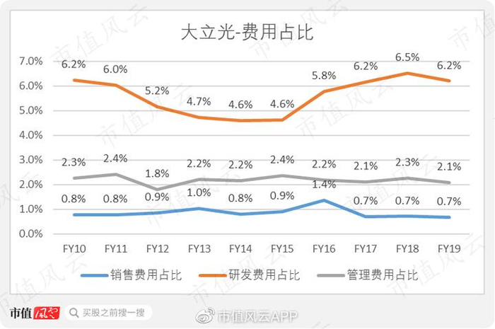 与大立光的费用占比做一个简单的对比。2019年大立光的研发费用占比和销售费用占比分别为6.2%和0.7%。