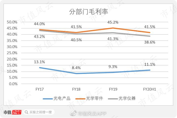 根据公司披露的数据,光学零件部门的毛利率在2020年上半年下滑至41.5%。光电产品的毛利率则上升至11.1%。另外,光学仪器的毛利率则下滑至38.6%。