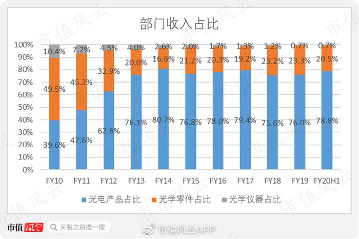 光学仪器的营收占比自2010年便不断下降,2020年上半年为0.7%。