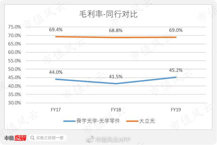 大立光近三年的毛利率分别为69.4%、68.8%和69.0%。而舜宇光学旗下光学零件部门的毛利率仅为44.0%、41.5%和45.2%。