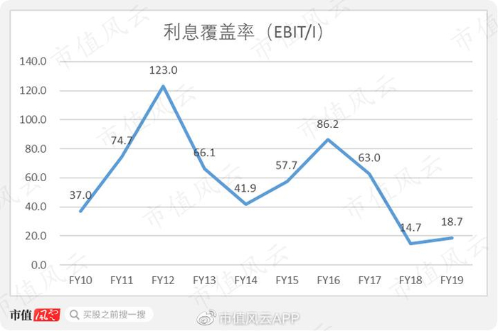 将银行贷款利息、应付债券利息和租赁负债利息等一块考虑,再采取谨慎的计算方式用营业利润除以利息费用得到的利息覆盖率,在2019年回升至18.7倍,利息覆盖问题不大。