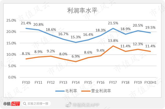 营业利润率趋势与毛利率非常相似,在2018年下滑至11.4%之后,在2019年反弹至12.3%,随后在2020年上半年下滑至11.4%。
