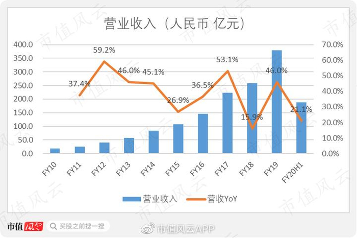2018年,营收增速下滑到15.9%之后,在2019年反弹至46.0%。