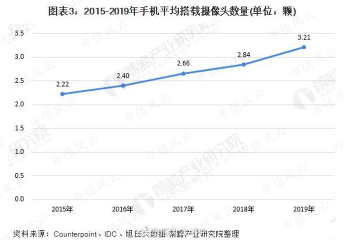 虽然智能手机市场一片愁云惨淡,但是智能手机上面搭载的镜头数量却屡创新高:根据前瞻产业研究院的数据,每台手机平均搭载的摄像头数量已经从2015年的2.22个上升至2019年的3.21个。