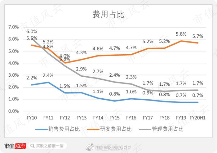管理费用的占比同样稳步改善,自2010年开始不断下降,2020年上半年占比为1.7%。符合风云君对一家优质上市公司的期待。