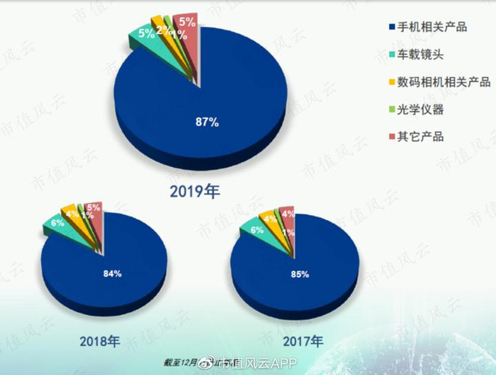 如果将公司营收按产品分类的话,手机相关产品占绝对的大头,2019年占比高达87%。其次是车载镜头相关产品,占比5%。