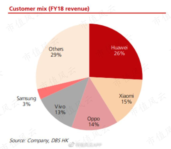 公司并未主动披露大客户的名单,但是在星展银行的一份研报中看到,按照2018年收入划分,前四大客户分别是华为、小米、Oppo和Vivo,分别占比26%、15%、14%和13%。