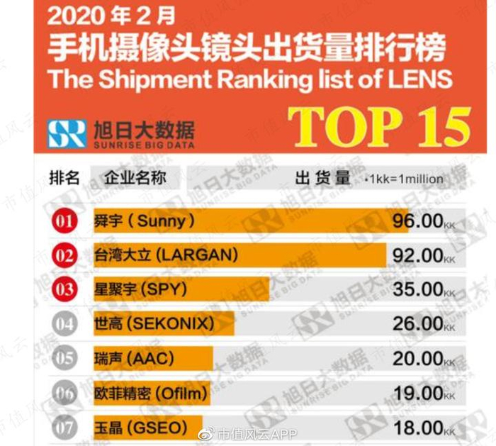 虽然大立光2019年出货量排名第一,但是根据旭日大数据提供的数据,2020年2月手机镜头出货量排名中,舜宇光学以9600万件排名第一,大立光以9200万件排名第二。
