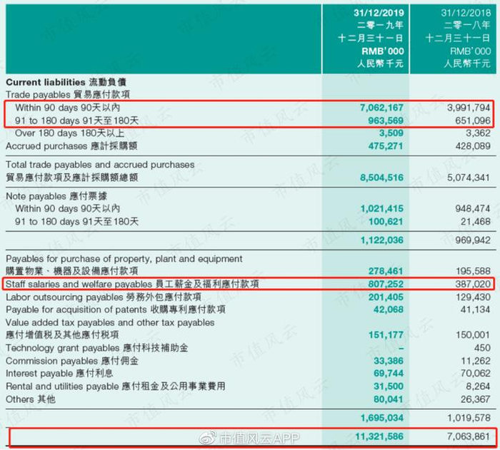 截止2019年末,贸易应付款及应计采购额总计85.0亿元,上年同期为50.7亿元。