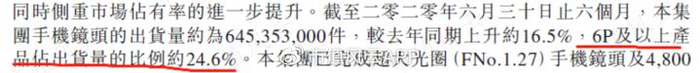 首先敲黑板,我们回顾一下公司的数据:2020年上半年公司旗下光电产品(主要是手机摄像模组)营收占比为78.8%,光学零件(主要是手机镜头、车载镜头等)营收占比为20.5%。