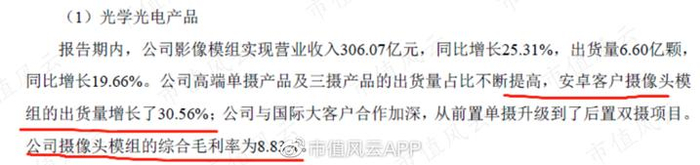 根据欧菲光2019年年报,目前摄像头模组的综合毛利率为8.8%,略低于舜宇光学旗下光电产品部门的毛利率9.3%。