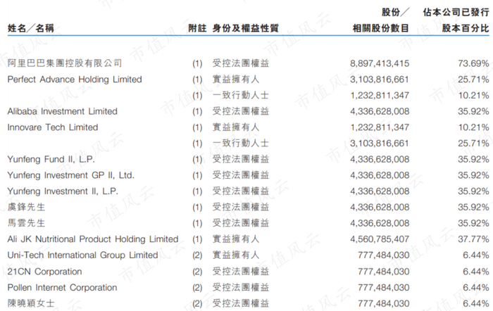 阿里健康毫无疑问是一家阿里系的公司。根据最新的年报,阿里巴巴合计持有阿里健康73.69%的股份,而且对其并表。
