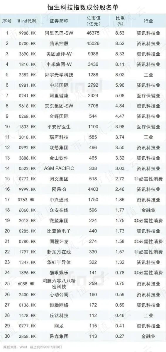 7月27日,恒生科技指数正式推出,其中还包括了腾讯(00700.HK)、美团点评(03690.HK)、小米(01810.HK)等公司。