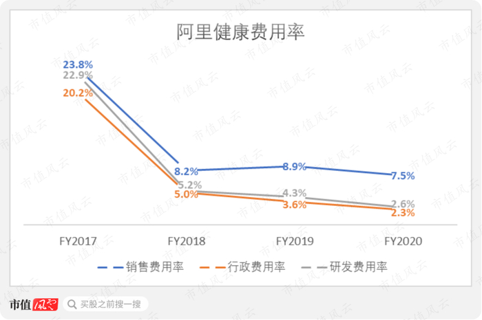 最近三个财年,由于业务规模的迅速扩大,阿里健康的行政费用率和研发费用率都在下降。其中在2020财年,两者分别为2.3%、2.6%,已经非常低了。