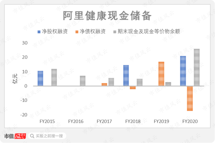 在2020财年,阿里健康通过发行新股募集了20.01亿元,同时没有进行大笔投资。这让公司的现金储备又大幅增加至25.95亿元。