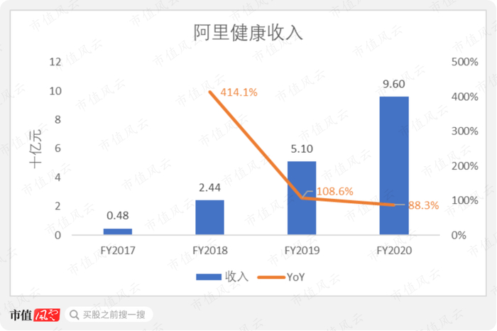 各项业务加总在一起,阿里健康2020财年收入为96.0亿元,2017-2020财年的CAGR高达172%。