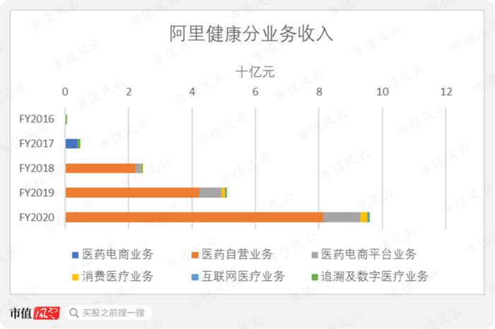 2020财年,阿里健康的业务中自营和平台收入占比分别为84.8%、12.2%。