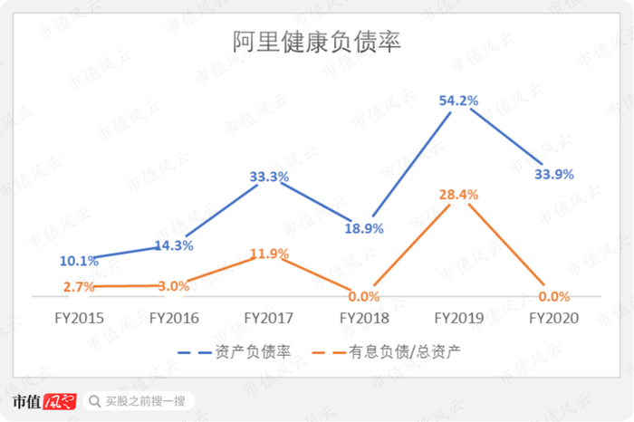 阿里健康主要依靠股权融资,公司有息负债占总资产的比例非常低,2020财年底为0,同时资产负债率也只有33.9%。