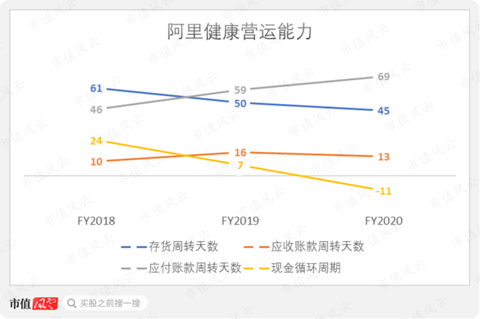 2020财年,阿里健康的存货周转天数为45天,连续两个财年下降;应付账款周转天数为69天,不断拉长,反映出公司对上游供应商的优势地位;应收账款周转天数为13天,相对稳定。