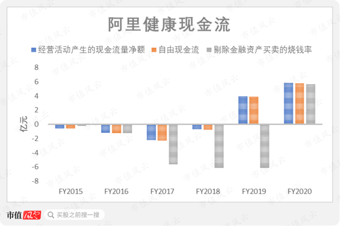2020财年,阿里健康的经营活动净现金流为5.84亿元,近四个财年不断变好,并且连续两个财年为正。