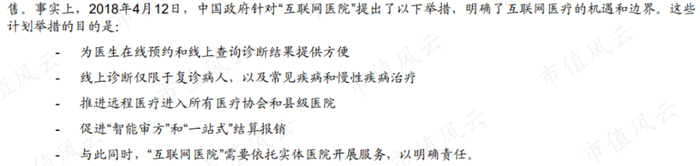 2018年4月,国务院提出了加快发展“互联网+医疗健康”的政策,推进了线上预约诊疗、远程医疗、医保智能审核和结算。