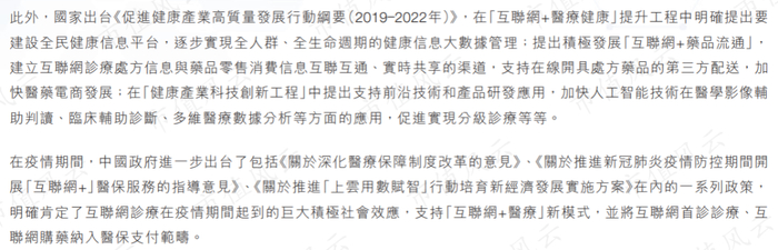 此外,政府还出台政策支持在线开具处方药的第三方配送,并将互联网首诊诊疗、互联网购药纳入医保支付范围。