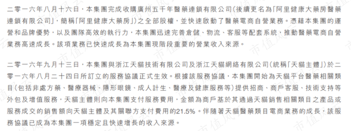 天猫主体则向阿里健康支付服务费用,金额为天猫商户根据成交额向天猫支付费用的21.5%。