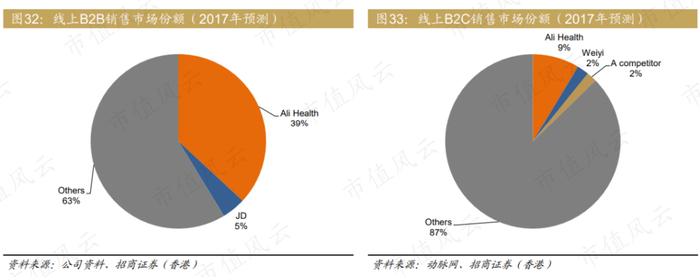 2017年线上B2B医药销售市场中,阿里健康的份额高达39%,遥遥领先于京东的5%。同年线上B2C医药销售市场中,阿里健康的份额为9%,领先于微医和平安好医生各2%的份额。