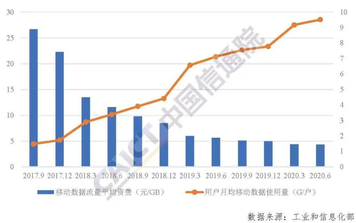 截至2020年第二季度末,我国移动数据流量平均资费为4.3元/GB,同比下降了23.25%;用户月均移动数据使用量为9.52GB,同比增长33.8%;移动通信月户均支出为47.8元,同比略降1.3%。