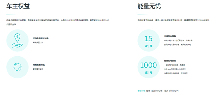 有一点不同的是,这是有蔚来官方提供的服务,如果你是蔚来的车主,且在购车是购买了“能量无优”的套餐,你就可以享受每个月15次的免费加电。假设你每个月都用完15次,折合下来一年180次,平均每次只要56元。
