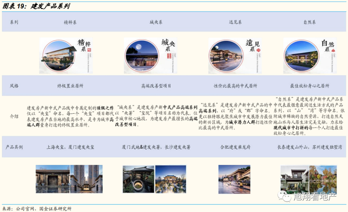 建发国际坚持产品研发,聚焦高端改善型产品定位。其产品优势始终保持行业领先,聚焦打造的新中式产品集现代时尚与古典于一体,极具特色,有效提升了产品的核心竞争力和品牌价值。公司秉承匠心理念,围绕“儒门,道园,唐风,华纹”的核心理念,成功研发“1+3”产品系列。产品系包括“精粹系”、“城央系”、“远见系”、“自然系”,主要分布在市区内、新兴城区和远郊自然资源优质地带。