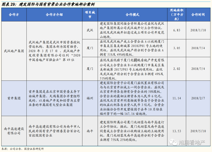 除传统的招拍挂外,公司依托母公司资源,积极与控股母公司联动通过吸并项目扩大土储,同时凭借良好的产品优势和国企背景优势与各地国企展开项目合作。2018年,建发国际与武汉是国资委背景的武汉地产集团分别在武汉、厦门2城就3个项目进行了合作。2018年与北京市属国有大型企业集团首开集团在福州合作项目。2019年与南平国有企业南平高速建设有限公司在南平合作开发项目,其中建发国际凭借其品牌优势负责操盘项目。