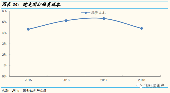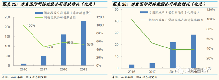 除了凭借良好的集团信用与各大银行形成长期合作关系,低成本融资外。建发国际能够从间接控股公司获得持续的低于市场融资成本的间接控股公司借款。2017年以来,间接控股公司借款占总有息负债成本比例始终保持在50%左右,是建发国际的主要输血来源。2019年获得间接控股公司借款约230亿元,占总有息负债比例53%,同时间接控股公司借款的利息支出占比仅为38%,低成本融资优势明显。
