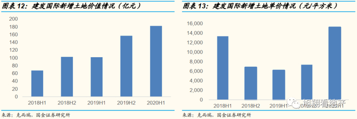 由于建发国际未公布拿地货值情况,我们根据克而瑞公布数据进行拿地分析。从拿地金额看,公司在两个窗口期拿地金额明显增加,2018年下半年新增拿地102亿元,占全年拿地金额60%;2019年下半年新增拿地金额157亿元,占全年拿地金额61%。从拿地单价看,两个窗口期拿地单价分别约6786元和7353元。