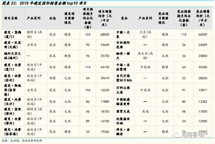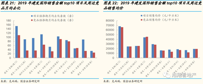 优质的土地储备和一流的产品力最终转化为建发国际更好的销售去化能力和溢价能力。我们取建发国际2019年销售金额top10项目进行统计,并根据项目区位,业态,产品定位等因素选取可比竞品比较两者月均去化套数和销售均价情况。