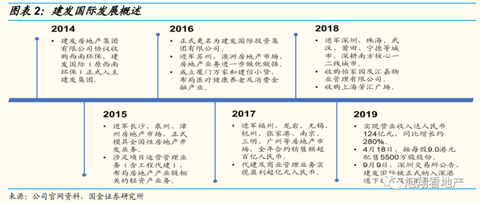 2014-2015 年,开启全国性房地产业务:2014 年底,建发房地产集团有限公司协议收购西南环保(建发国际前身),正式入主。2015 年,进军长沙、泉州、漳州房地产市场,建发国际正式开展全国性房地产开发业务。