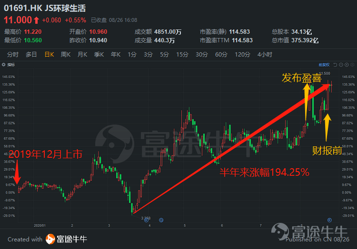 "2020年8月10日,JS环球生活(01691.HK)在港交所发布盈喜公告:上半年综合盈利预期将大幅增加至不少于1亿美元,同比增幅不低于356.60%。股价在盈喜发布当天大幅上涨27.36%。截至发布,股价从曾经到3.6港元攀升到12.0港元。