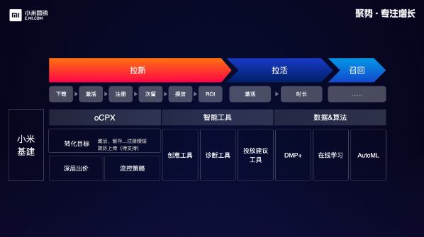 2、 投放周期价值。基于“小米基建”的能力,加持从拉新、拉活到召回的全周期价值,高效完成下载、激活、注册、次留、ROI等各种目标。