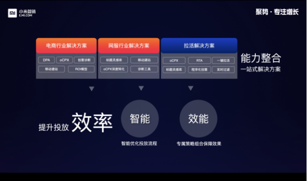 例如,电商行业解决方案、网服行业解决方案、拉活解决方案等。这些整合方案可以针对垂直行业,也可针对某个专项目标。一站式解决方案大大提升了投放的效率。之后,我们可通过提升智能与效能两个方面,不断优化周期性的价值。