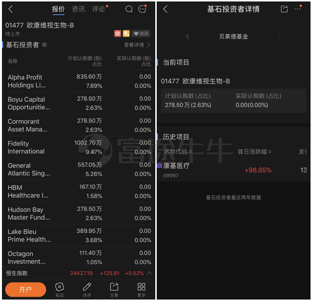 以$欧康维视生物-B(01477.HK)$为例,富途牛牛App该个股的详情页中,点击任一基石投资者可查看其历史项目的上市情况。