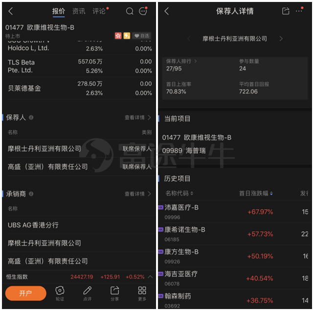 仍以以$欧康维视生物-B(01477.HK)$为例,个股详情页中点击任一保荐人可以进入保荐人详情页,浏览该保荐人过往保荐公司的上市情况。