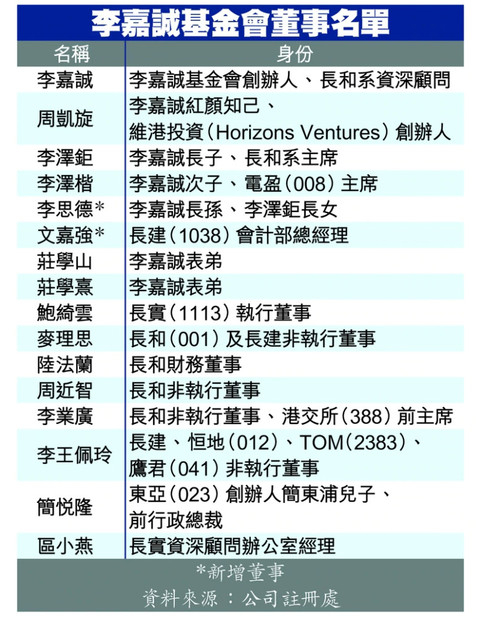 据了解,基金会目前共有16名董事,包括李嘉诚本人、红颜知己周凯旋、李泽钜、李泽楷、表弟庄学山及庄学熹等人,以及为李氏家族打江山的重臣。